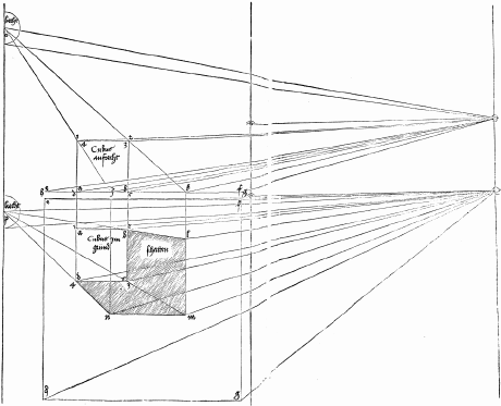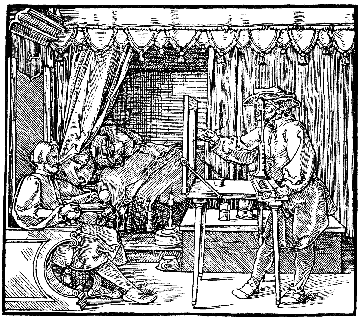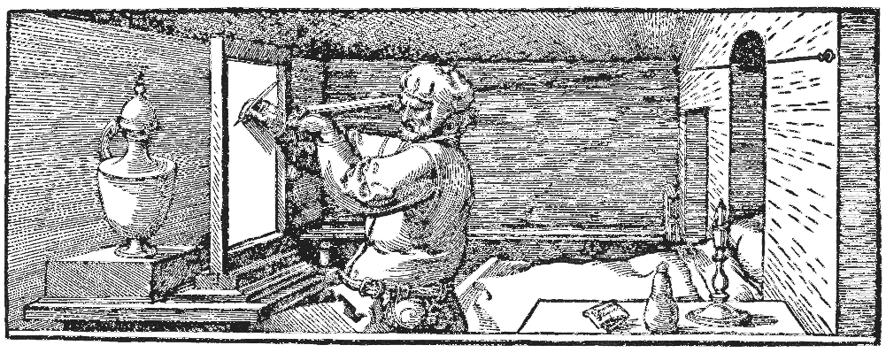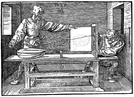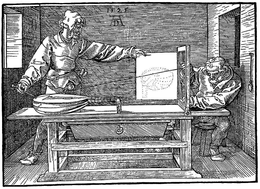 Bist du in einem Saal, so schlag ein große Nadel mit einem weiten Öhr, die darzu gemacht ist, in ein Wand, und setz das für ein Aug. Dardurch zeuch einen starken Faden und häng unten ein Bleigewicht daran. Darnach setz einen Tisch oder Tafel so weit von dem Nadelöhr, darin der Faden ist, als du wilt. Darauf stell stet ein aufrechte Rahm zwerchs gegen dem Nadelöhr, hoch oder nieder, auf weliche Seiten du wilt, die ein Türlein hab, das man auf und zu müg tan. Dies Türlein sei dein Tafel, darauf du malen wilt. Darnach nagel zween Fäden, die als lang sind als die aufrecht Rahm lang und breit ist, oben und mitten in die Rahm, und den anderen auf einer Seiten auch mitten in die Rahm und laß sie hängen. Darnach mach ein eisnen langen Steft, der zuvörderst am Spitz ein Nadelöhr hab, darein fäden den langen Faden, der durch das Nadelöhr an der Wand gezogen ist, und fahr mit der Nadel und langen Faden durch die Rahm hinaus, und gib sie einem anderen in die Hand, und wart du der anderen zweier Fäden, die an der Rahm hängen. Nun brauch dies also: Leg ein Lauten oder was dir sunst gefällt, so fern von der Rahm als du wilt, und daß sie unverrückt beleib solang du ihr bedarfst, und laß deinen Gesellen die Nadel mit dem Faden hinausstrecken auf die nötigisten Punkten der Lauten, und so oft er auf einem stillhält und den langen Faden anstreckt39, so schlag allweg die zween Fäden an der Rahm kreuzweis gestrackes an den langen Faden, und kleb sie zu beeden Orten mit einem Wachs an die Rahm, und heiß deinen Gesellen seinen langen Faden nachlassen. Darnach schlag die Türlein zu und zeichen denselben Punkten, da die Fäden kreuzweis übereinander gehn, auf die Tafel, darnach tu das Türlein wieder auf und tu mit einem anderen Punkten aber, also bis daß du die ganzen Lauten gar an die Tafel punktierst, dann zeuch all Punkten, die auf der Tafel von der Lauten worden sind, mit Linien zusammen, so sichst du, was daraus wird. Also magst du ander Ding auch abzeichnen. Diese Meinung hab ich hernach aufgerissen.