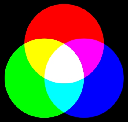 Drei Strahler (Scheinwerfer) beleuchten mit Lichtfarben in jeweils einer der drei Grundfarben R(ot), G(rün) und B(lau) eine weiße Fläche. Die Farbkegel mögen sich dabei teilweise überschneiden. Jedes Projektionslicht erscheint in seiner reinen Farbe, solange es allein auf die Projektionsfläche trifft. Überschneiden sich zwei Lichtkegel so entstehen Sekundärfarben, die bunten Grundfarben Gelb, Magenta (Magentarot) und Cyan (Cyanblau). In der Mitte überschneiden sich alle drei Lichtkegel hier sieht man die Tertiärfarbe Weiß (den definitionsgemäß weißen Hintergrund). Die unbunte Grundfarbe Schwarz wird durch die Dunkelheit im Raum repräsentiert. Durch Intensitätsregelung der Lichtstrahler lässt sich im Überschneidungsbereich aller drei Grundfarben jede beliebige Farbnuance ermischen.