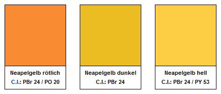 - Neapelgelb oder Antimongelb war ursprünglich ein Bleiantimonat, dessen Zusammensetzung noch nicht eindeutig geklärt ist. Neapelgelb wurde als keramisches Pigment schon 2500 vor unserer Zeitrechnung auf babylonischen Ziegeln gefunden. Historische Namen wie Luteolum neapolitanum oder Giallino bezeichnen den italienisch-neapolitanischen Ursprung. Es wurde in der Tafelmalerei seit dem 17.–18. Jahrhundert verwendet und löste vermutlich das bis dahin typische Bleizinngelb ab. Ähnlich wie Siena, Umbra und Ocker erweitert Neapelgelb als Tertiärfarbe die Palette der Kunstmaler in Richtung Erdfarben. Neapelgelb hat ein gutes Deckvermögen und eine sehr gute Lichtbeständigkeit. Es ist mit den meisten Pigmenten und mit allen Bindemitteln verträglich.Die heutigen Herstellerfirmen für Künstlerölfarben verzichten ganz auf den Zusatz von Blei. Im Handel erhältlich sind drei Varianten: