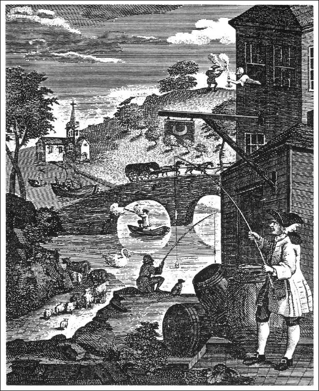 Es sieht bei weiterer Betrachtung aus, als ob alle perspektivischen Fehler, welche überhaupt möglich sind, in diesem Bild vereint seien und als ob ihre witzige Zusammenstellung auf kluger Berechnung beruhe. Tatsächlich hat Hogarth das Bild als Titelblatt für ein Lehrbuch der Perspektive entworfen. Es trägt als solches eine erklärende Unterschrift, die allerdings bei unserer Abbildung fehlt: „Who ever makes a Design without the knowledge of perspective will be liable to such Absurdities as are shown in this Frontispiece.“ („Wer auch immer eine Zeichnung ohne Kenntnisse der Perspektive anfertigt, wird solchen Absurditäten ausgesetzt sein, wie sie dieses Titelbild zeigt.“).