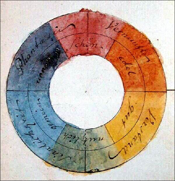 17Goethe beschäftigte sich im Austausch mit Malern und Philosophen intensiv auch mit „Der Farbe“, die in seinem Gesamtweltbild als Einheit stand. Er entdeckte das Phänomen der subjektiven Farben und Grundprinzipien des Farbensehens, den Nachbildeffekt und den Simultankontrast. Aus eigener Ansicht interessierte ihn das Phänomen der farbigen Schatten als Teil einer Farbtheorie, die Farbentstehung aus lebendigem Ineinanderwirken von Hell und Dunkel versteht. Zwangsläufig empfand er das Grundphänomen der Newtonschen Optik, das vom Farbspektrum eines gebrochenen Lichtstrahls ausgeht, als eine Verirrung. Durch das Prisma entstehe vielmehr durch „Übereinanderschieben“ von Hell und Dunkel ein gelber und ein blauer Rand. Diese Ränder vermischen sich je nach dem Anteil von Hell und Dunkel zu Grün oder Rot (so entstehen die Farben des Regenbogens - rot, gelb, grün, blau, violett). Gelb bedeutet einen größeren Hellanteil, Blau überwiegendes Dunkel.