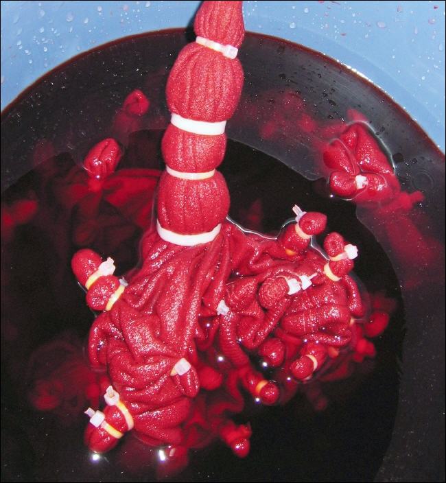 Ein Kilogramm Cochenille ergibt ca. 50 Gramm Karmin. Die getrockneten Schildläuse enthalten etwa 14 % Karmin.