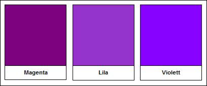 Violett, die Veilchenfarbe: Farbcode: #8B00FF Lila, die Fliederfarbe (Fliederviolett): Farbcode: #9932CC Magenta: Farbcode: #8B008B (dunkles Magenta)