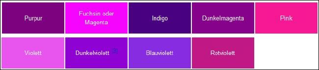 Für die violetten Farbtöne, also die zwischen Rot und Blau, gibt es mehrere Wörter, die sich in der Bedeutung etwas unterscheiden.