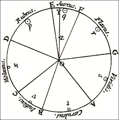 Newton verband das violette Ende des Spektrums mit dem roten Anfang und schuf so seinen Farbenkreis, der spätere Ordnungssysteme beeinflusste. Damit werden die linearen Farbordnungen, die sich am Regenbogen und verwandten Effekten orientierten, überwunden, die keinen anschaulichen Bezug zwischen Blau und Rot herstellen konnten. |