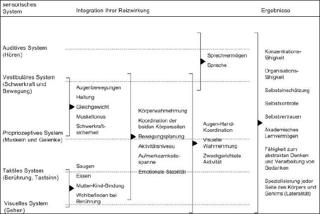 Wichtiger allerdings sind die Annahmen, die Anna Jean Ayres 1984 dann zur weiteren Entwicklung der sensorischen Integration gemacht hat: Diese führen zum Aufbau komplexer Systeme, sogenannter höherer Hirnfunktionen, die ein koordiniertes Verhalten und schließlich ein zielgeleitetes und systematisches Handeln erst möglich machen.